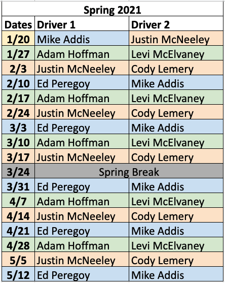 Here is the driving rotation for Winter/Spring 2021.