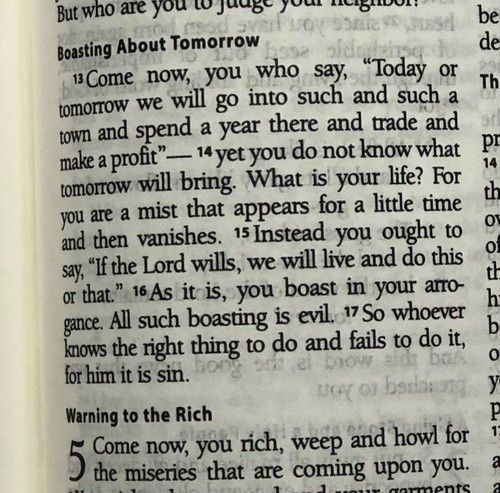 James 4:15: “If it is the Lord’s will, we will live and do this or that.” No one knows what tomorrow holds. For Christians, we need to acknowledge that the future will be complicated by sin, by the craziness of this world. Some, maybe much, will touch us. God must allow it in this world of free-will and consequences, but he is still in control! Trust him and give evidence, acknowledging this verse.