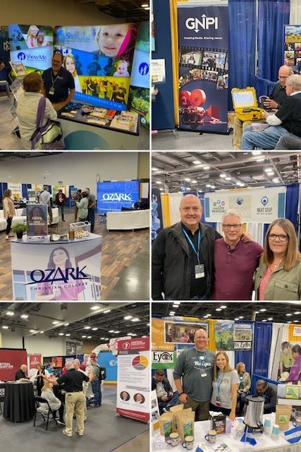 I won’t get too specific about each mission, just too much for one article, but in the same nature of the conference I just want to promote missions in general. In the first picture collage, you can see the missions supported by SHCC (starting in the left-hand corner and moving clockwise) Show-me Christian Youth Home, Good News Productions, Ozark Christian College, Master Provisions, Central Christian College, and His Eyes. Show-Me talks with an attendee at the conference about their work providing a Christian home to youth in need. Next, a representative from Good News Productions, International, (GNPI) demonstrates how their solar kits show videos (yellow case) to present the Gospel in areas with no electricity. Ozark and Central Christian Colleges talk with attendees about their campuses and what they offer to educate future leaders of the church. Middle right, Rick and I (Rexanne) stand with Roger Babik of Master Provisions, and you need a book to tell all the good work he does helping orphans, feeding the hungry, etc. Lastly in the bottom corner, Felipe and Valerie Colby of His Eyes stand at their booth. They were selling coffee and His Eyes coffee mugs as they talk about their coffee plantation and how it helps people in Honduras as well as talking with attendees about the Milk Project, their medical clinic and yes, I could go on…
